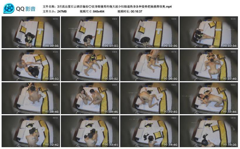 【影片名称】:萤石云酒店偷拍纹身眼镜哥约炮大波少妇舔逼热身各种姿势把她搞得很爽【影片格式】:MP4【影片大小】:247MB【影片时间】:00:16:37【影片说明】:无码【影片截图】: